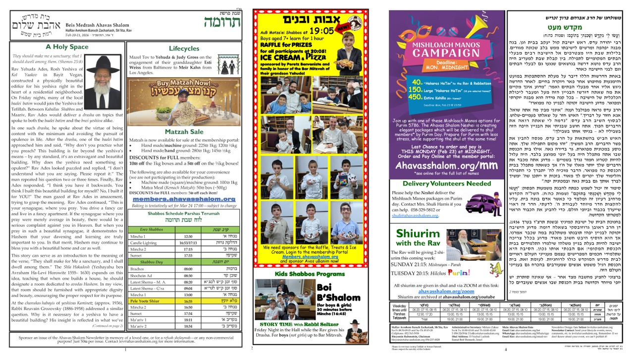They should make me a sanctuary; that I should dwell among them. (Shemos 25:8) Rav Yehuda Ades, Rosh Yeshiva of Kol Yaakov in Bayit Vegan, constructed a physically beautiful edifice for his yeshiva right in the heart of a residential neighborhood. On Friday nights, many [...]