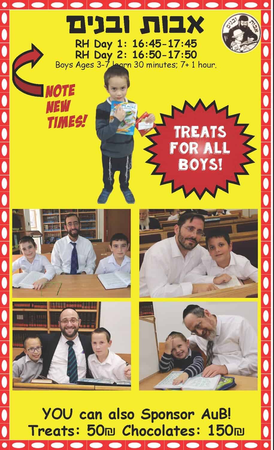 - Support Avos uBanim learning on Shabbos Afternoon by sponsoring “rewards” for the boys!